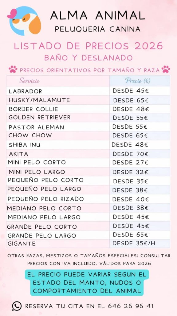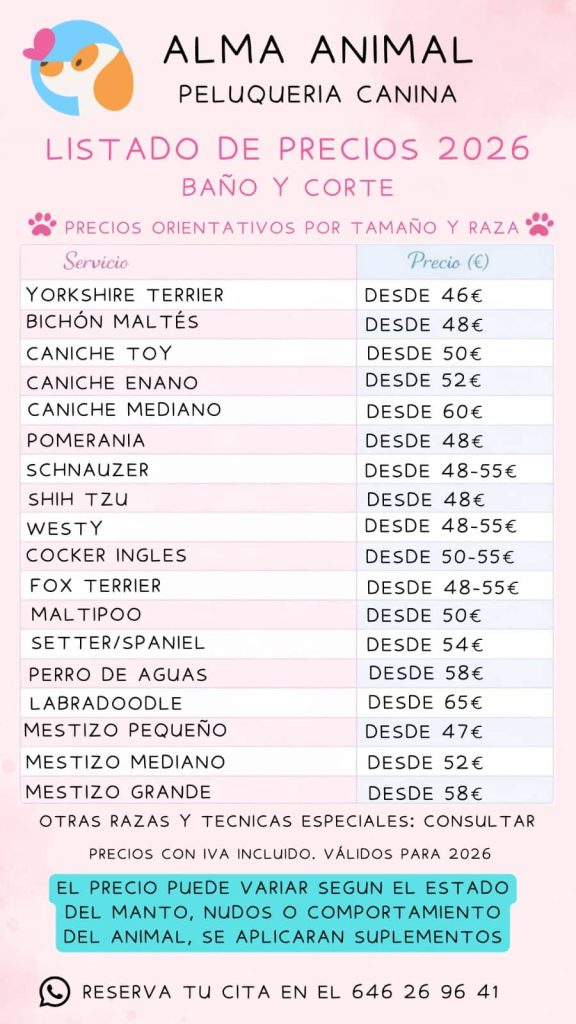 Las tarifas son válidas para perros en condiciones normales de mantenimiento. La presencia de nudos, muda excesiva, parásitos o manejo difícil conllevará la aplicación de suplementos